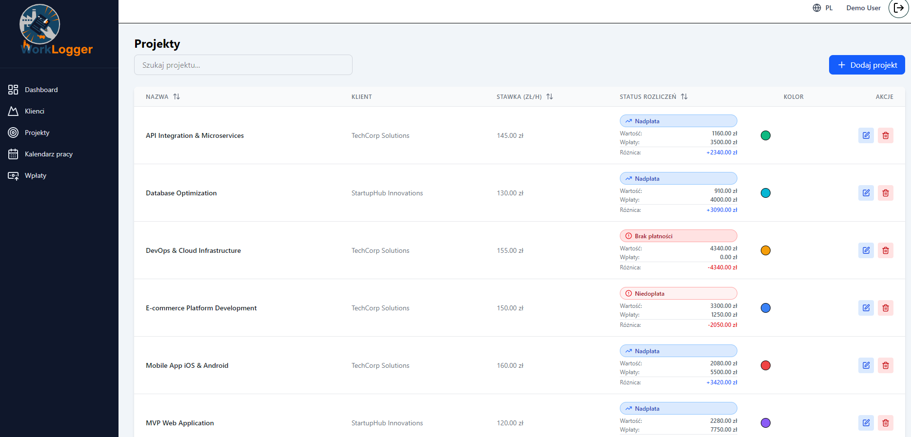 - Zarzązanie projektami w ramach danego klienta – ustalanie stawki godzinowej za pracę przy prjekcie.