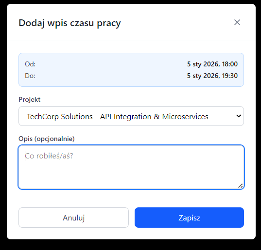 Aplikacja służąca do rejestrowania czasu pracy przy projektach na rzecz swoich klientów, automatycznie obliczająca spodziewane wynagrodzenie (na podstawie stawki godzinowej).